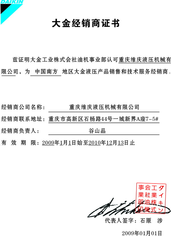 重慶維慶液壓公司成功簽約與日本大金(DAIKIN) 合作;成為一級(jí)代理服務(wù)商;維慶公司憑借日本大金高品質(zhì)的液壓元件和完善的營銷體系,共同開拓中國液壓市場(chǎng),為更多的企業(yè)提供優(yōu)質(zhì)服務(wù)。